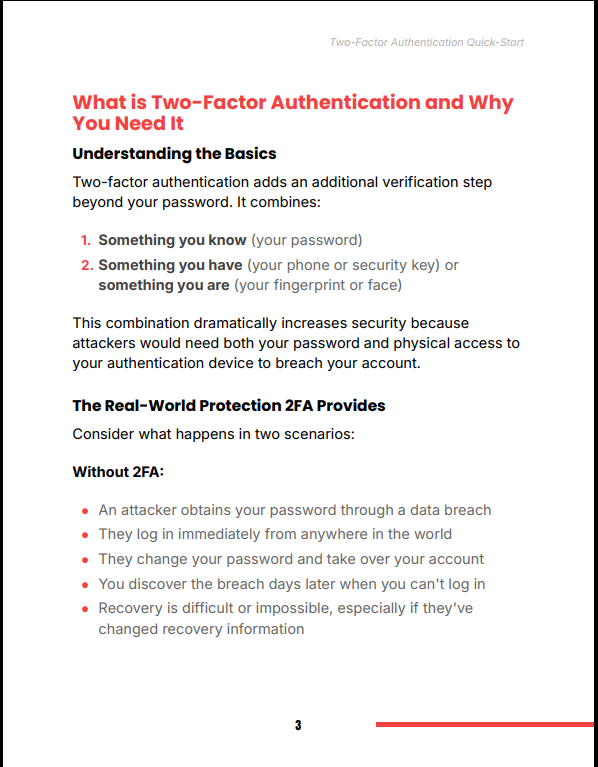 Most account breaches don’t happen because passwords are weak—they happen because passwords are reused, leaked, or phished. Two-Factor Authentication Quick-Start Guide focuses on **eliminating single-point failure** by adding a second verification layer that attackers can’t easily bypass. It’s one of the fastest, highest-return security upgrades you can make.