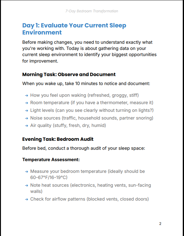 7-Day Bedroom Transformation Guide gives you a structured, practical system to turn your bedroom into a high-performance sleep environment. Instead of relying on motivation or routines alone, this guide focuses on environmental design—so your space works for you automatically.