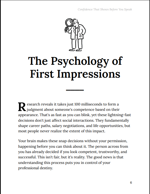 Through psychology-backed insights and practical routines, this book helps you take control of first impressions, eliminate inconsistency, and build a personal standard that naturally commands respect and attention.